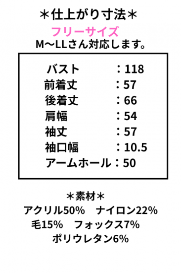 *仕上がり寸法*バスト118 着丈前57後66 肩幅54 袖丈57 袖口幅10.5 アームホール50