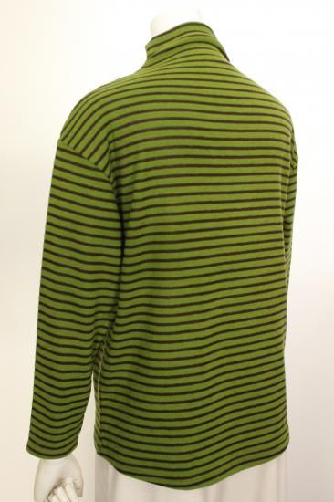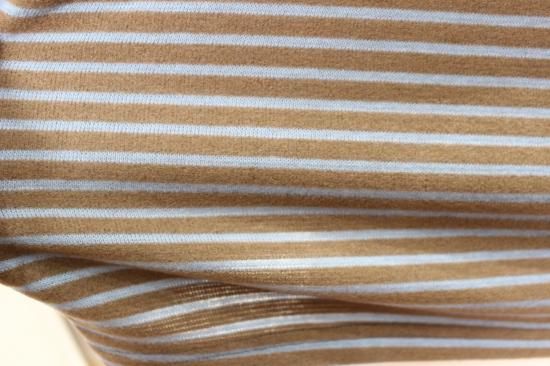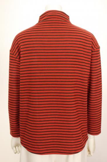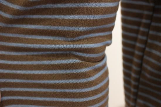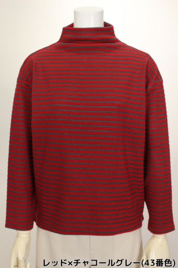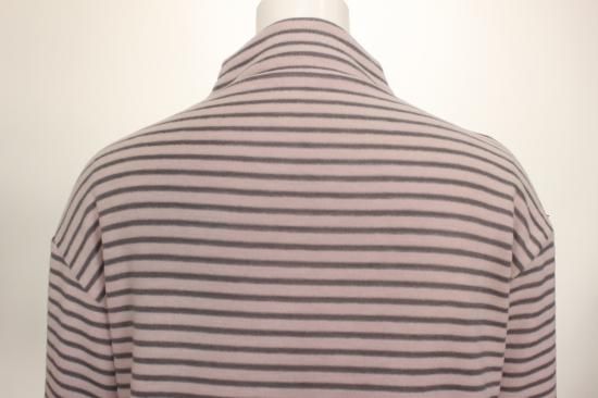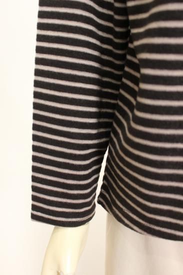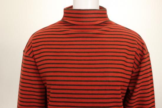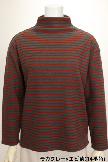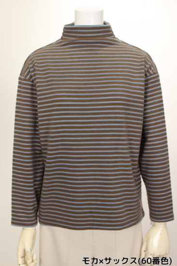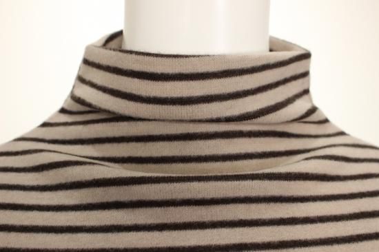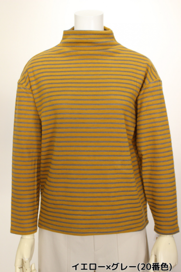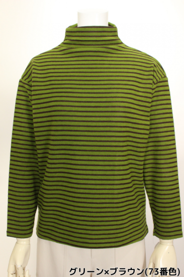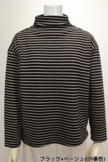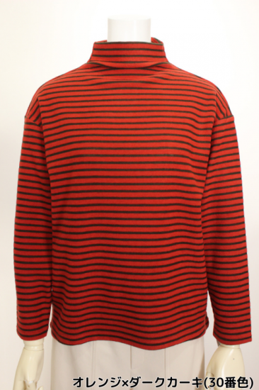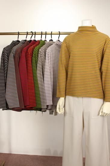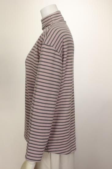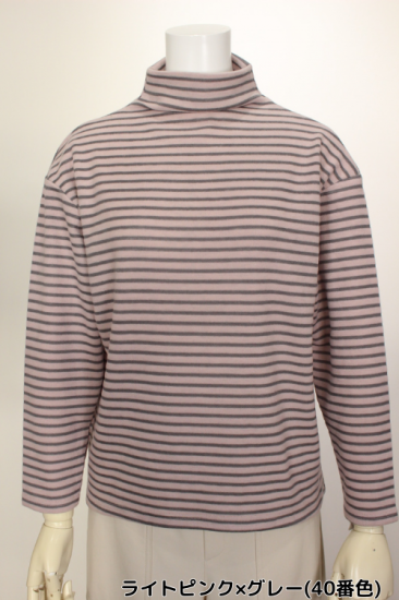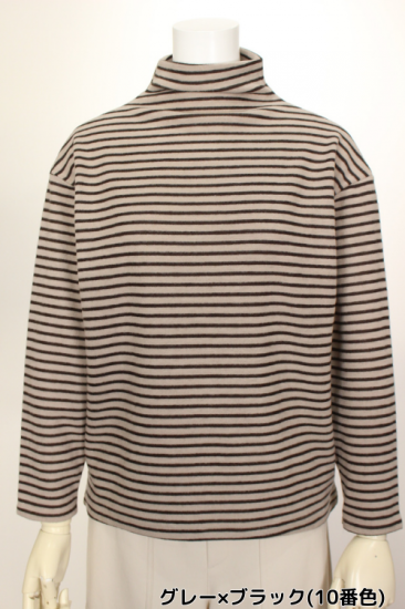 お首に優しく沿い上がる、程よいボトルネックのカットソー。ボーダー柄はコーデ合わせしやすいです。普段着、お部屋着にもお出かけ時にも役立ちます。