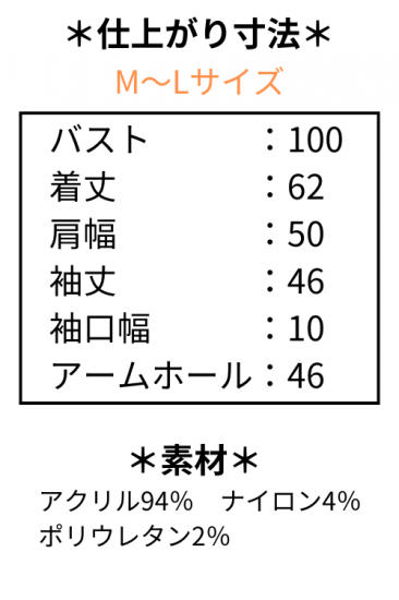 バスト100 着丈62 肩幅50 袖丈46 袖口幅10 アームホール46