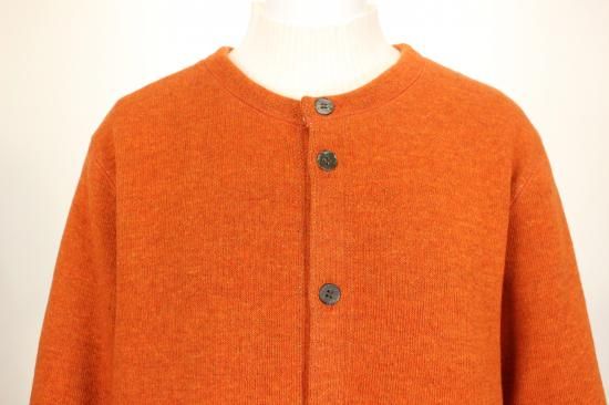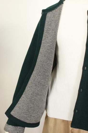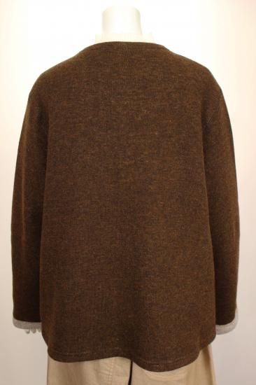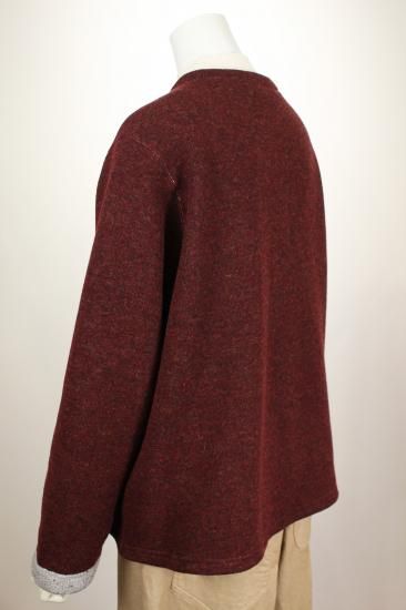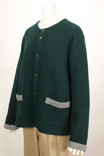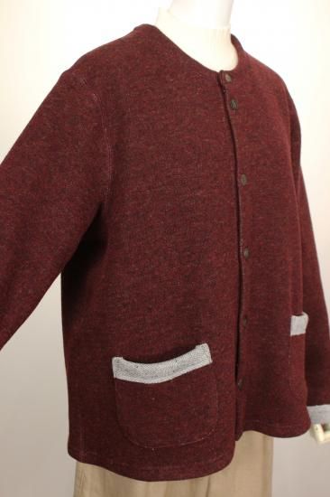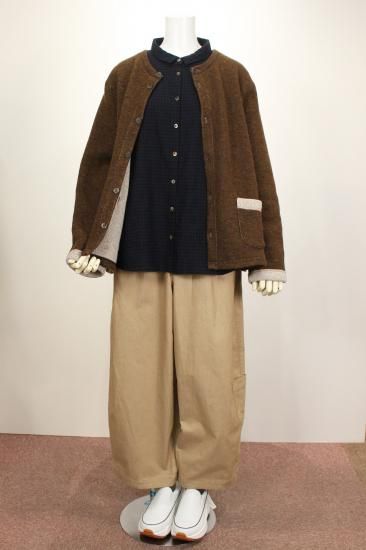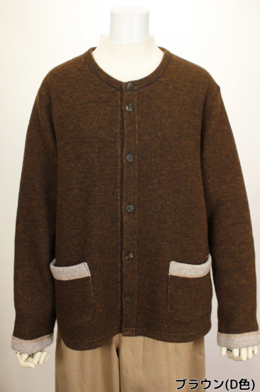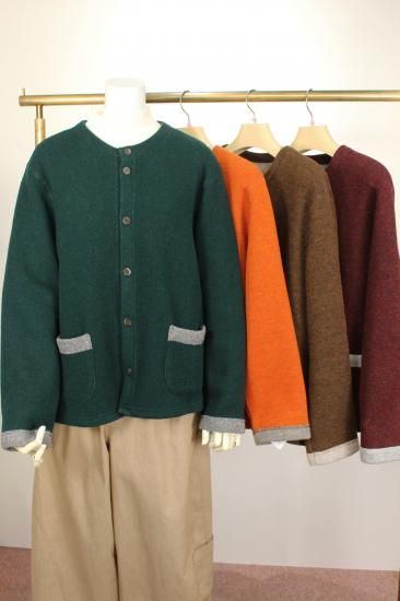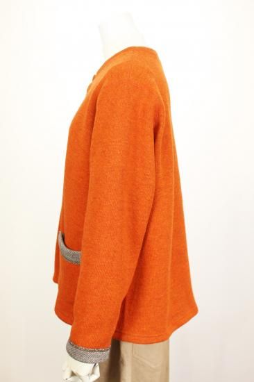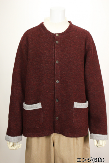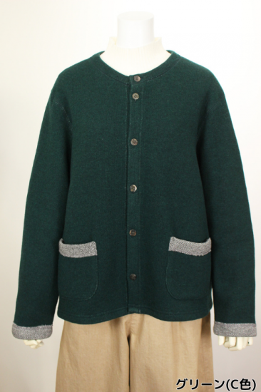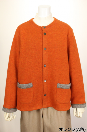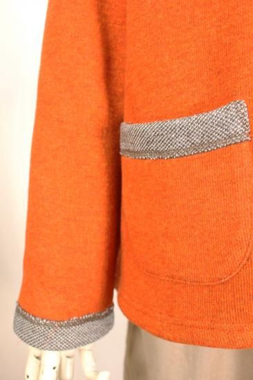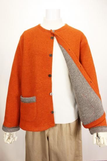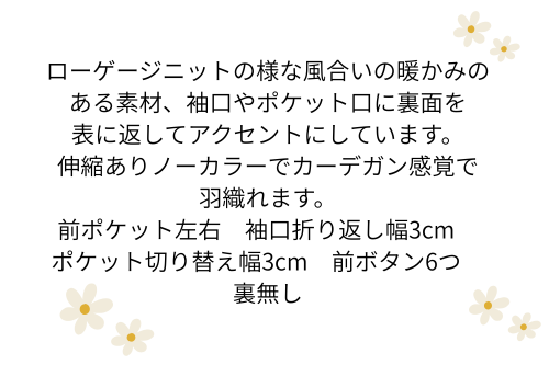 ローゲージニットの様な風合いの暖かみのある素材、袖口やポケット口に裏面を表に返してアクセントにしています。伸縮ありノーカラーでカーデガン感覚で羽織れます。