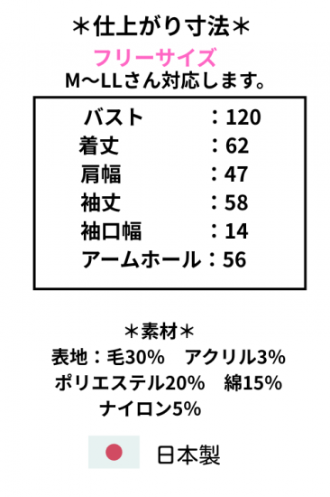 *仕上がり寸法*バスト120 着丈62 肩幅47 袖丈58 袖口幅14 アームホール56