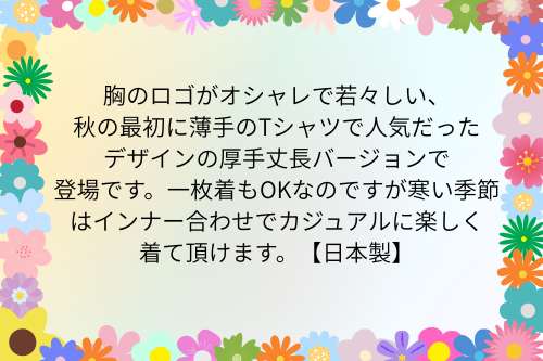 胸のロゴがオシャレで若々しい、秋の最初に薄手のTシャツで人気だったデザインの厚手丈長バージョンで登場です。一枚着もOKなのですが寒い季節はインナー合わせでカジュアルに楽しく着て頂けます。【日本製】